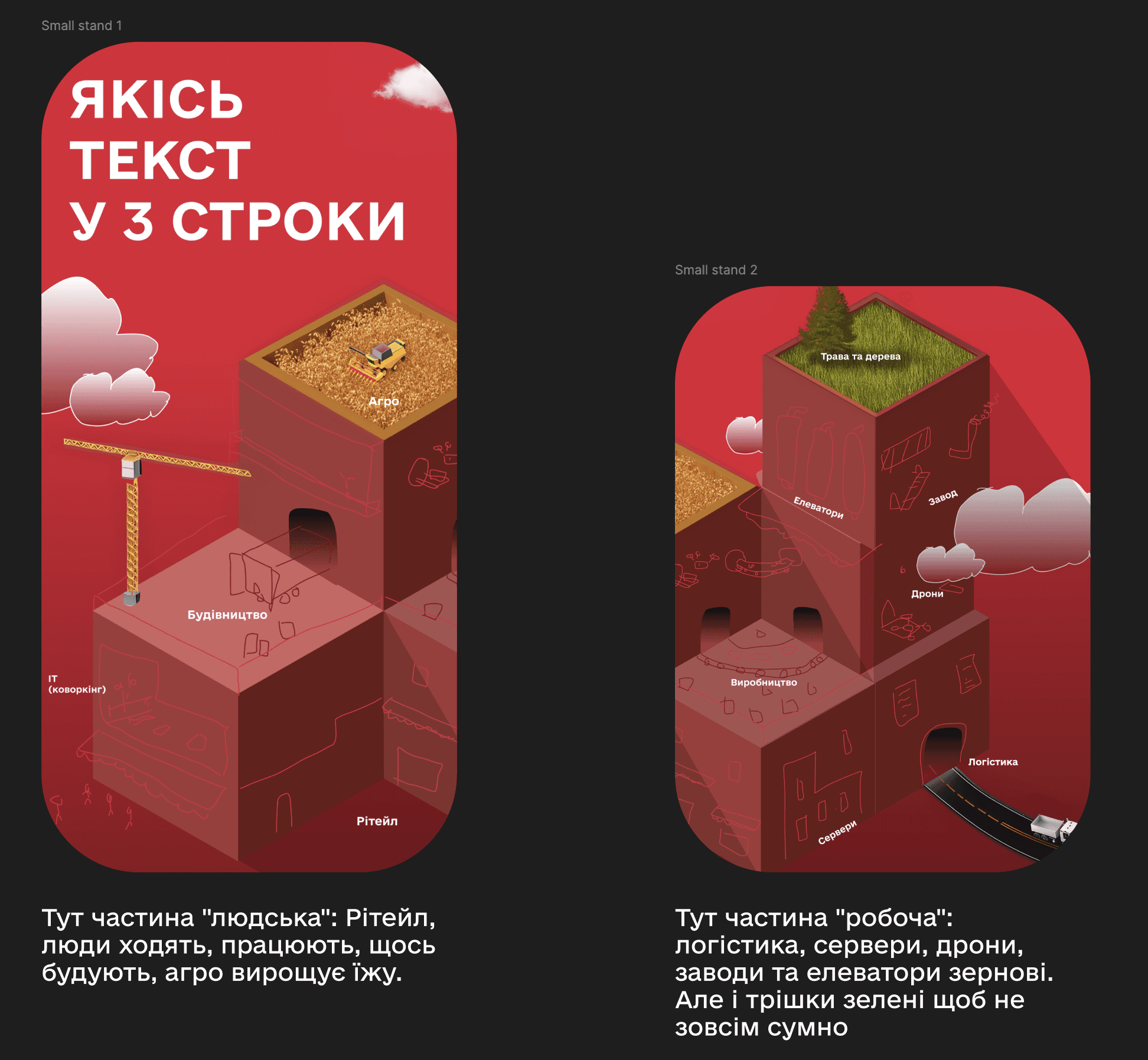 Перше і головне — це визначитись із темою та ТЗ. Цей візуал доволі детальний та великий, тому краще все проговорити на початку, щоб потім не переробляти, коли все буде майже готове. Тому ми визначились із концептом, секторами, клієнтами Gigacloud, яких розмістимо, і в якому форматі буде стенд. Формат в ітозі трішки поміняли в процесі, так як спочатку планували, що це буде одне зображення, але в ітозі вирішили робити два окремих.